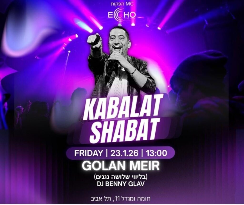 ליין קבלות שבת של גולן מאיר יוצא לדרך יום שישי 23.1.26 במועדון האקו לא אביב רחוב חומה ומגדל 11, בליווי ה DJ האגדי בני גלב BENNY GLAV ומי שעוד לא הצטרף זה בדיוק הזמן – קישור בתמונה